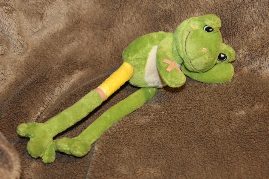 nach dem sich gestern unser Fröschi bei einem zwischenfall schwer verletzt hatte, können wir heute berichten das sein kleines Frosch-Beinchen in einer aufwendigen Operation gerettet werden konnte. Er braucht nun noch etwas Ruhe.